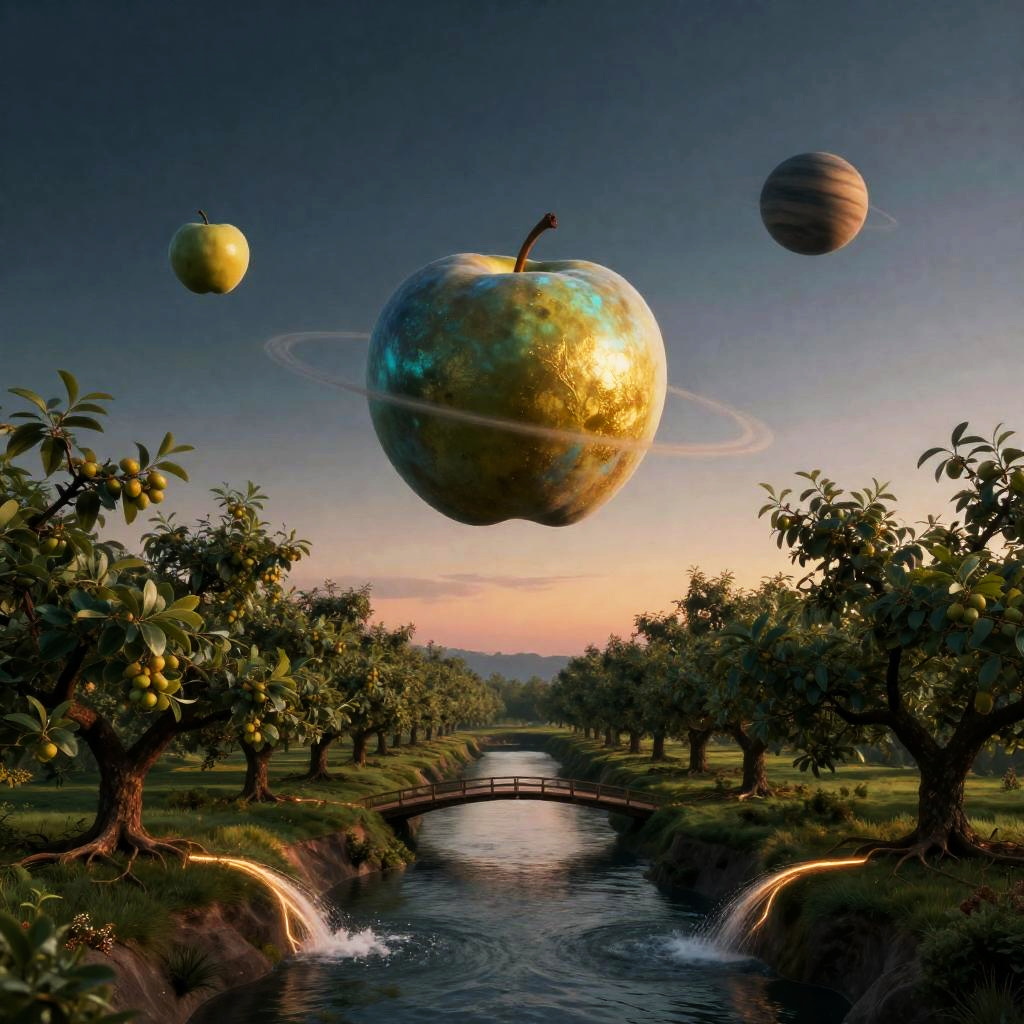 Digital artwork of a surreal orchard at sunset with floating planets, including a glowing apple planet, beside a winding stream.