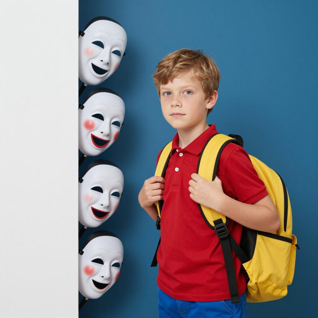 A young boy with short, messy blonde hair wears a colorful jester costume with white ruffled collar, holding a clear plastic water bottle in his right hand. He stands in front of a dimly lit house with bushes and stairs in the background. The boy's expression is serious and focused. The image is a photograph with low lighting.