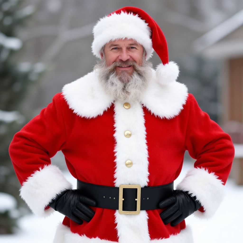 A bearded man dressed in a classic red and white Santa suit with black leather gloves poses confidently outdoors in a snowy setting. The festive costume features traditional elements such as a fluffy collar, gold buttons, and a wide belt, creating a joyful holiday atmosphere.