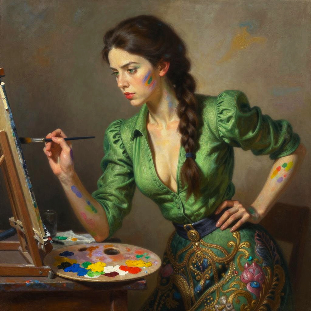 (detailed fingers:1.3), modelshoot style, (nsfw:1.2), full shot body, accent lighting, detailed green eyes, eyeshadow, 20 years female, sexy, green shirt, intricate shirt, (arched back:1.2), cleavage, (open shirt:1.4), (paint brush:1.1), paints, easel, (colorful paint stains on skin:1.4), (colorful paint stains on clothes:1.4), palette, sneer, leaning on table, read hair, braid, intricate skirt, (high erect nipple:1.3), red lips, (hand_on_hip:1.2), professional, (majestic oil painting by ed blinkey, atey ghailan, studio ghibli, by jeremy mann, greg manchess:1.4), trending on artstation, intricate, high detail, sharp focus, dramatic, photorealistic painting art by larry elmore, fine details, illustration, masterpiece, best quality, highres, exquisite details and textures, pretty detailed face