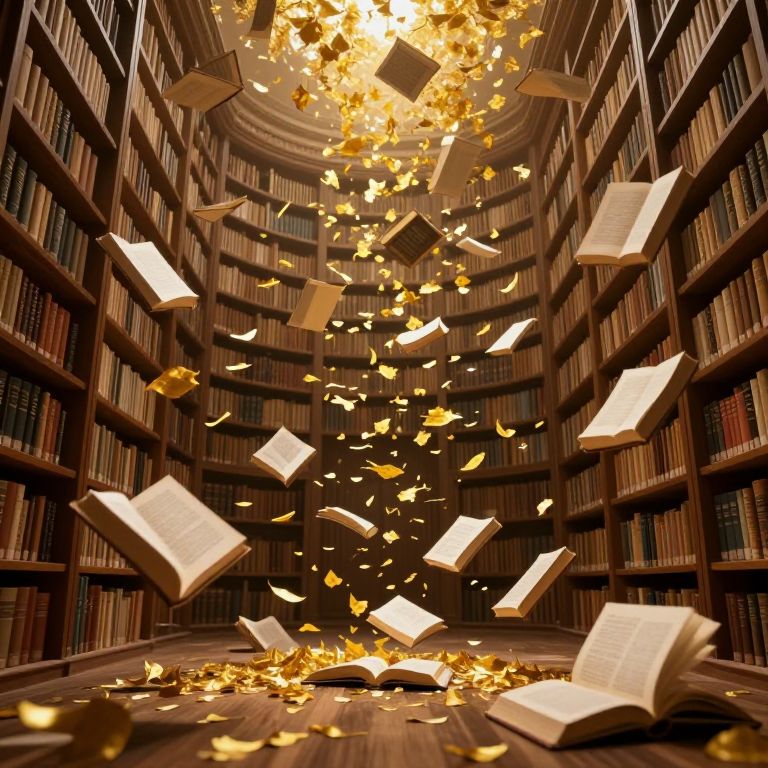 In a timeless library, books defy gravity, cascading like golden leaves from the heavens, their pages fluttering and scattering across the floor in a mesmerizing dance of knowledge and wonder.