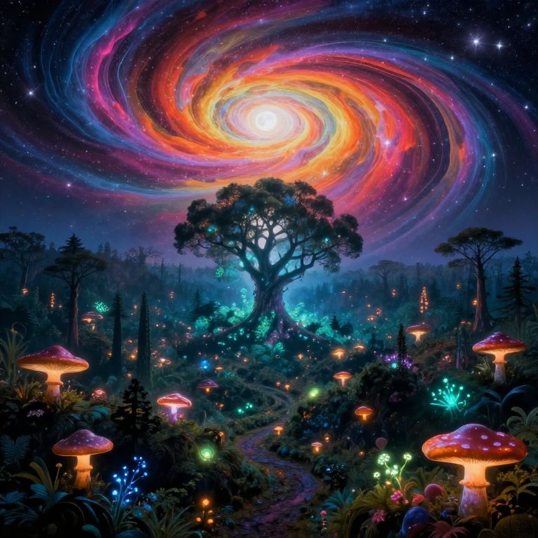Dreamy digital fantasy artwork of a glowing spiral galaxy above a magical forest with bioluminescent mushrooms, glowing plants, and a central, towering tree