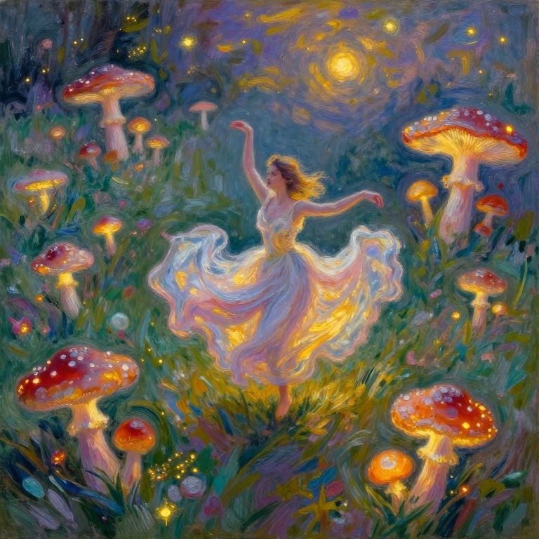 A captivating scene unfolds in an impressionistic style, as celestial nymph gracefully dances amidst a field of glowing mushrooms under the soft golden light at twilight. Viewed from a unique aerial perspective, akin to seeing through the eyes of a floating star, this enchanting dreamscape evokes both wonder and tranquility. The vibrant colors and fluid brushstrokes create an atmospheric scene that captivates the imagination, reminiscent of Monet's ethereal masterpieces.