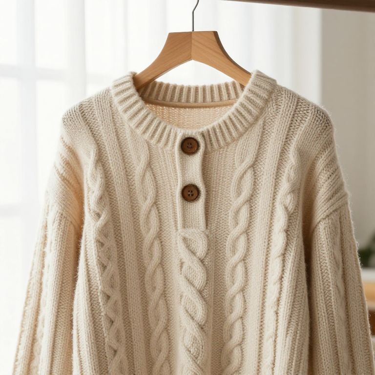 Cozy beige knit sweater hangs gracefully on a wooden hanger, featuring three rustic brown buttons and intricate cable patterns that evoke warmth and nostalgia against a soft window light backdrop.