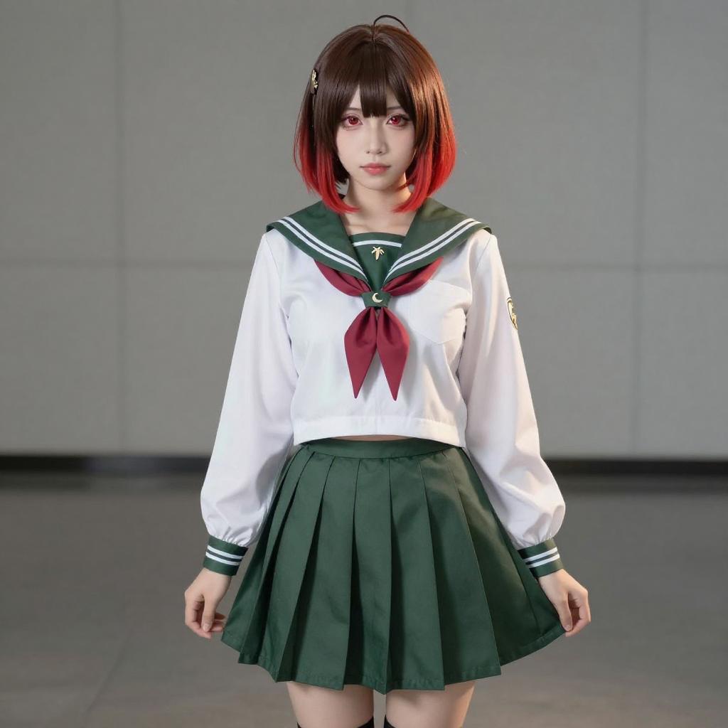 Photo-realistic cosplay photo of person in mutsuki kai ni (kancolle) costume. Full body. Standing. Full length. 1girl, red eyes, brown eyes, short hair, brown hair, gradient hair, red hair, serafuku, serafuku, green skirt, pleated skirt, green sailor collar, crescent pin, red neckerchief, professional photoshoot