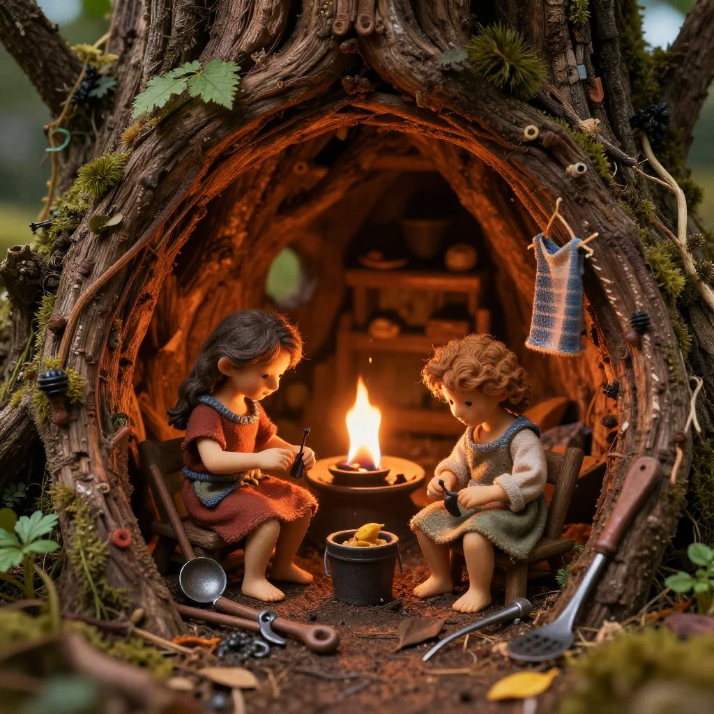 Liliputienses crafting delicate tools and clothing from natural elements inside a tree hollow home, warm firelight casting soft shadows, detailed fantasy miniature life, rich textures and vibrant natural colors, intimate and charming scene