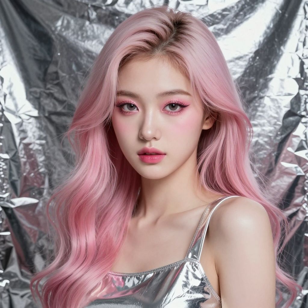 Photorealistic digital artwork of a young Asian woman with vibrant pink and purple hair, wearing a shiny, metallic blue and pink top, against a lumin
