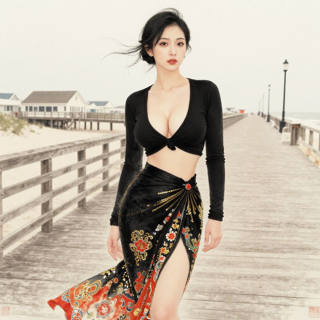 A slim woman in a vintage photo style, wearing a long-sleeve black crop top with a plunging V-neckline and a high-waisted black wrap skirt adorned with gold sequins, standing on a fashionable boardwalk in Seaside Heights. Sexy. Pretty face and beаutiful eyes. Big breasts BREAK chinese, asian, traditional Chinese aesthetics, delicate brushwork, ink wash painting textures, vibrant red and gold accents, elegant Asian female, silk fabrics, ornate patterns, soft lighting, ethereal atmosphere