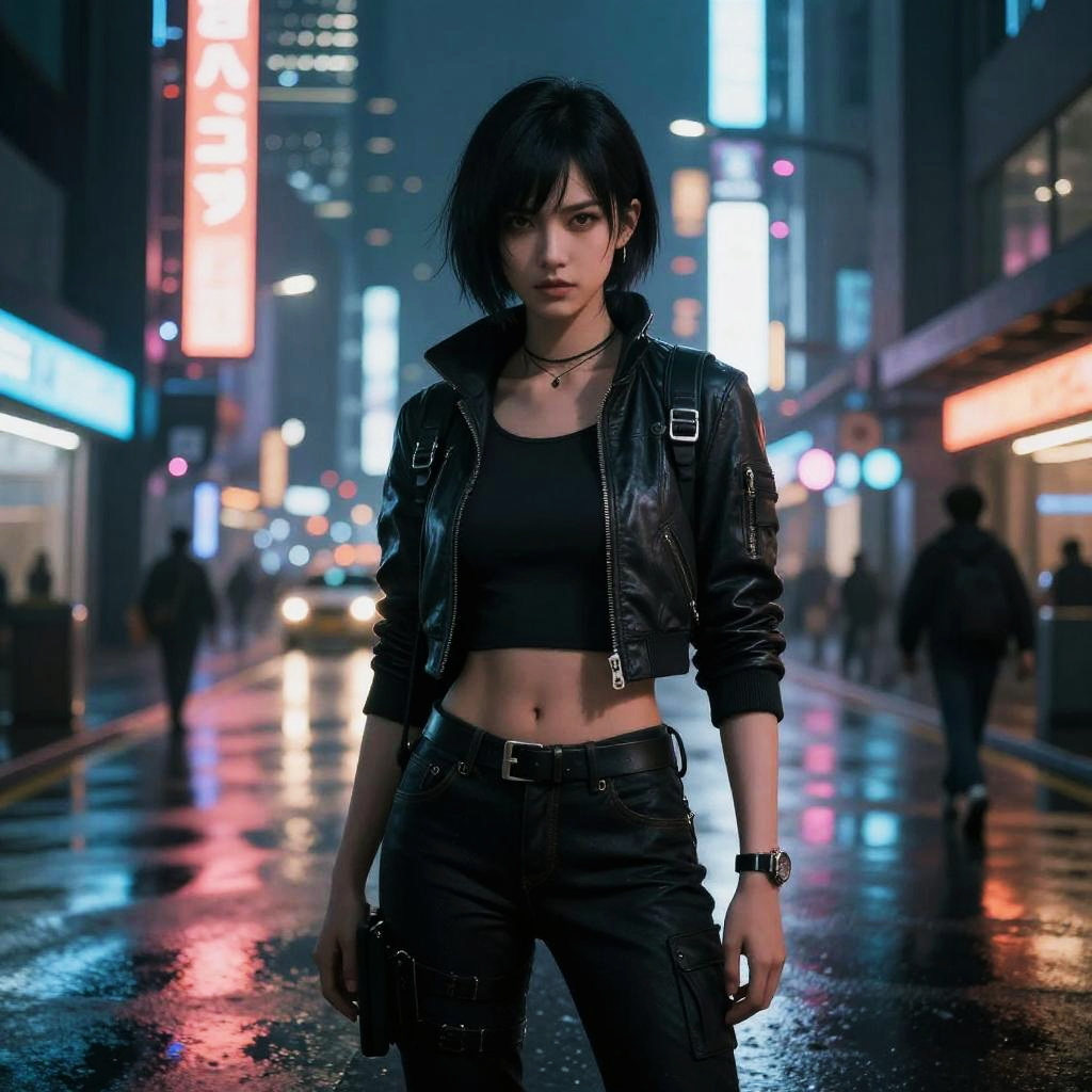 Cyberpunk city street at night, wet pavement, neon lights, young woman with black bob haircut, black leather jacket, crop top, black pants
