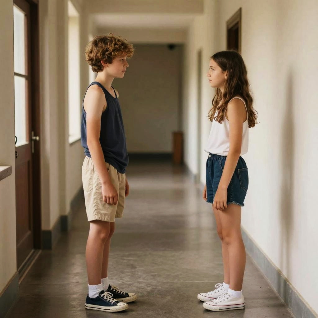 Realistic photo.A Georgia O'Keeffe-style corridor with a boy and a girl facing each other, featuring casual shorts and a tank top and soft lighting. realistic photo