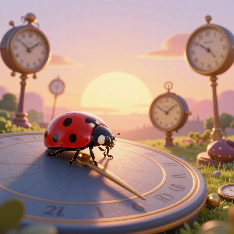 Photograph-like CGI image depicting a bright red ladybug with black spots standing on a blue, circular sundial. The sundial has gold lettering and a protruding hour hand. In the background, four ornate, gold clock faces with white faces and black Roman numerals are blurred, set amidst a lush, green garden with colorful flowers. The sunset sky is a gradient of pink, orange, and purple hues, casting warm light and soft shadows. The scene is whimsical and serene, blending natural and clockwork elements.