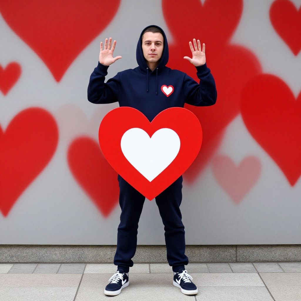 Full-body portrait of a young man wearing a navy blue hooded sweatshirt and pants, standing in front of a wall with large red heart shapes. He holds a large red heart-shaped prop with a white heart design on it, matching the smaller heart on his sweatshirt. The scene is urban with tiled flooring, and the man poses with both hands raised, fingers spread.