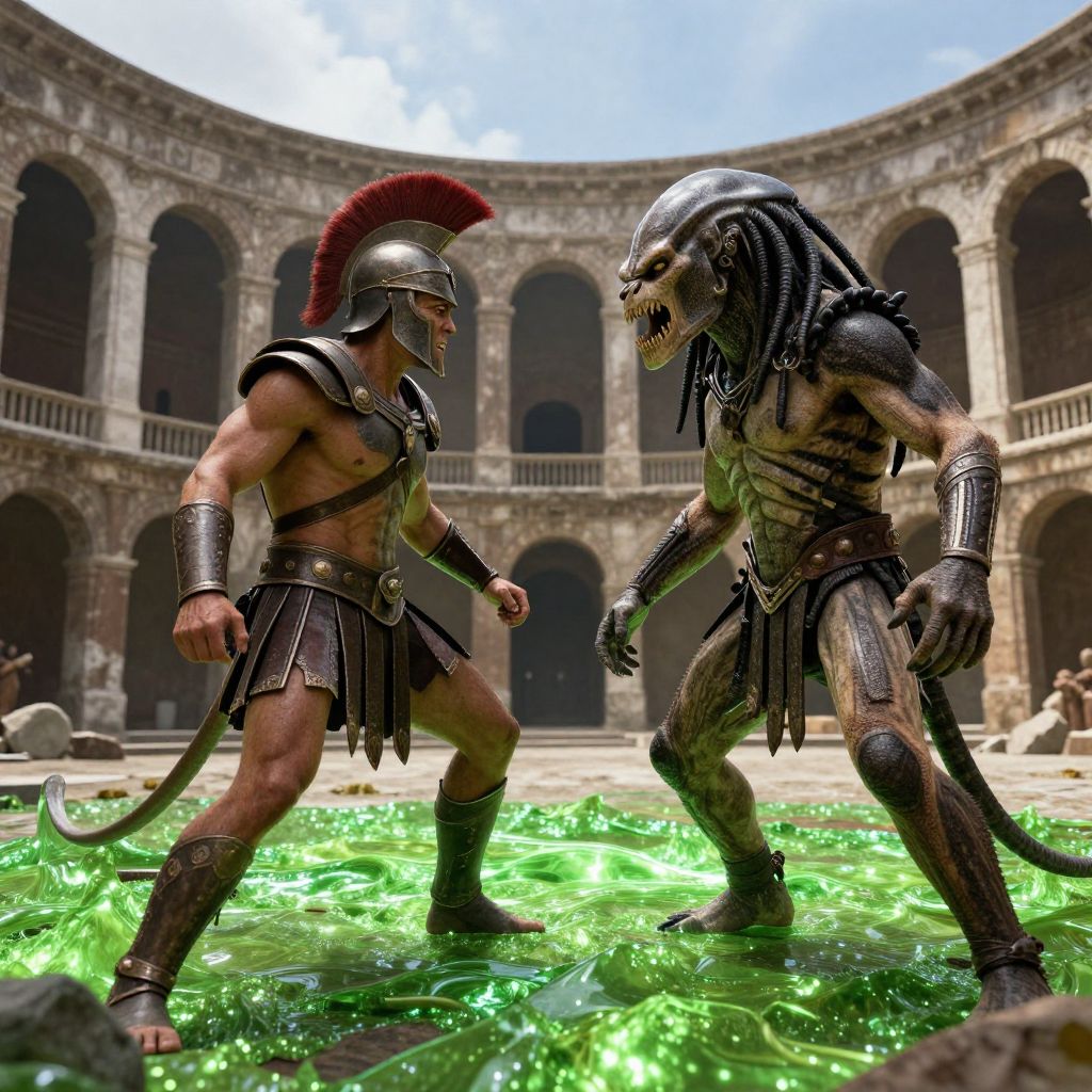 The predator roaring at a spartan warrior in a roman coliseum, green glowing fluid on the ground and on the predator, 8 k award winning photo, amazing