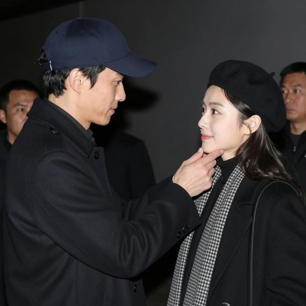 Man in white shirt and blue cap with gold trim, standing, looking up. Woman with dark hair, red cherry hairpins, topless, leaning in, eyes closed, inhaling purple laser beam from man's nose. Background with white decorative objects, green curtains, and tree branches. Man's expression neutral, woman's expression intense focus. Two people, indoors.