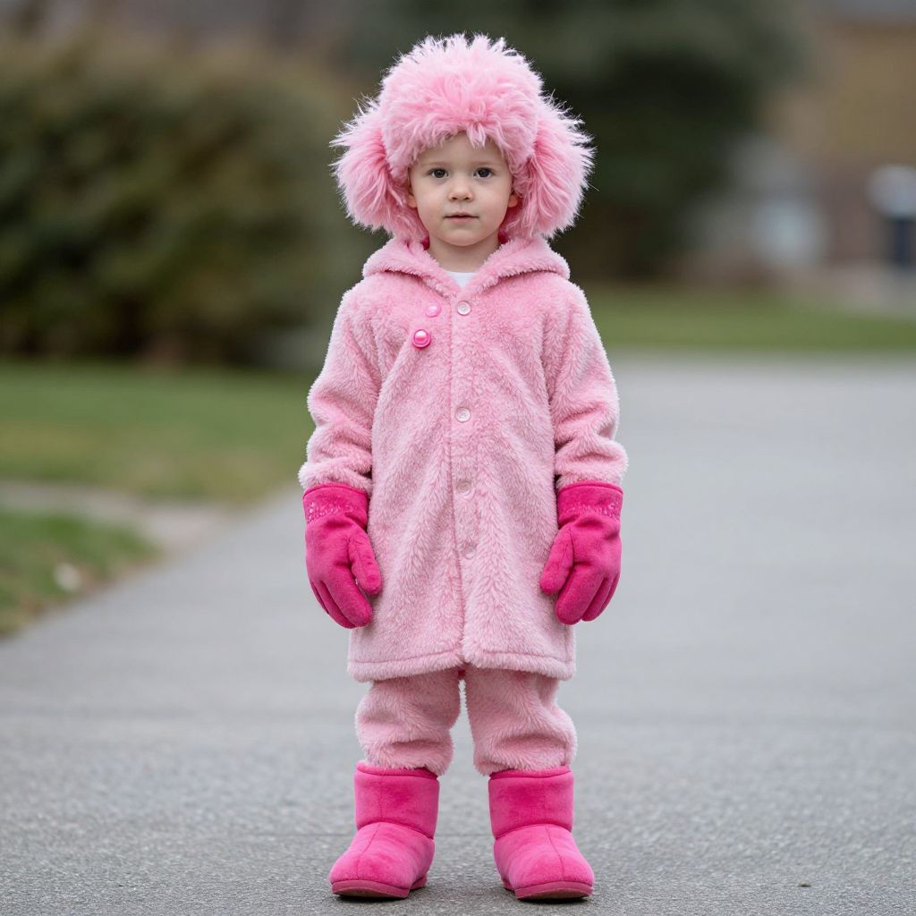 Pink poodle toddler costume, solo, gloves, standing, full body, 1boy, male focus, pink footwear, looking at viewer, mittens, pink gloves, hood, coat