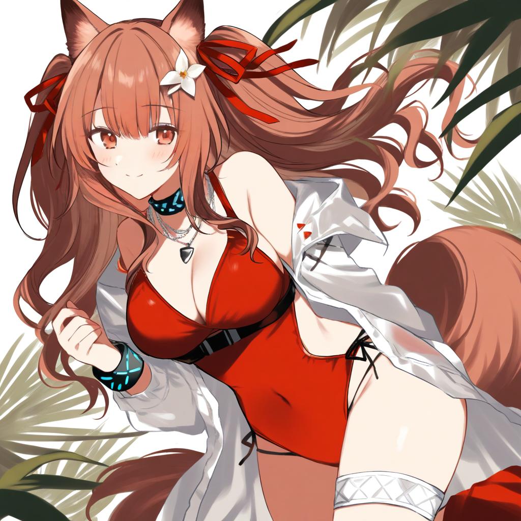 Annytf, indie virtual youtuber, 1girl, fox girl, fox ears, fox tail, animal ear fluff, brown eyes, purple eyes, long hair, brown hair, pink hair, star hair ornament, medium breasts, large breasts, cleavage, thighs, highleg leotard, red leotard, leotard under clothes, black thighhighs, long sleeves, bare shoulders, virtual youtuber, virtual youtuber, by artist goback, leet