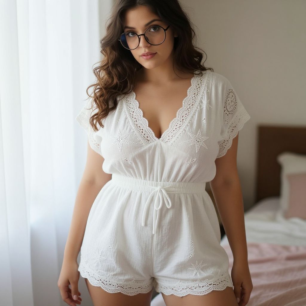"Woman, casual bohemian, white lace-trimmed romper with embroidered star pattern, v-neckline, short sleeves, cinched waist, relaxed fit shorts, large round eyeglasses, soft wavy hair, bedroom setting with natural light, sheer curtains, and a hint of a pink bedspread.. Sexy. Pretty face and beаutiful eyes. Big breasts."