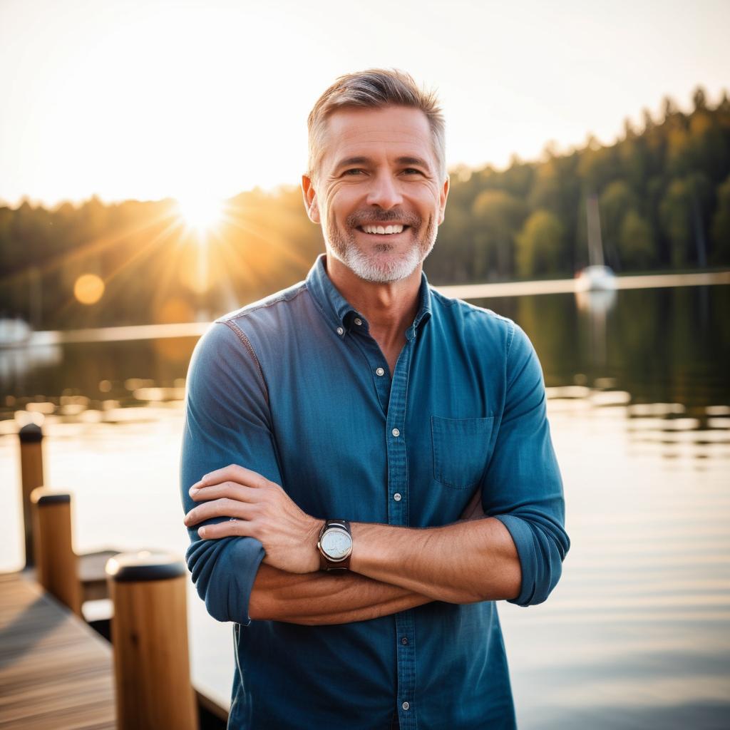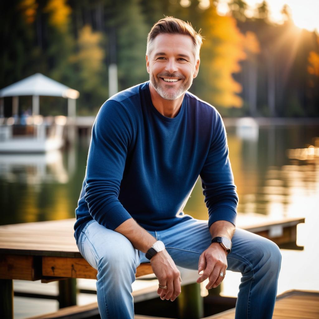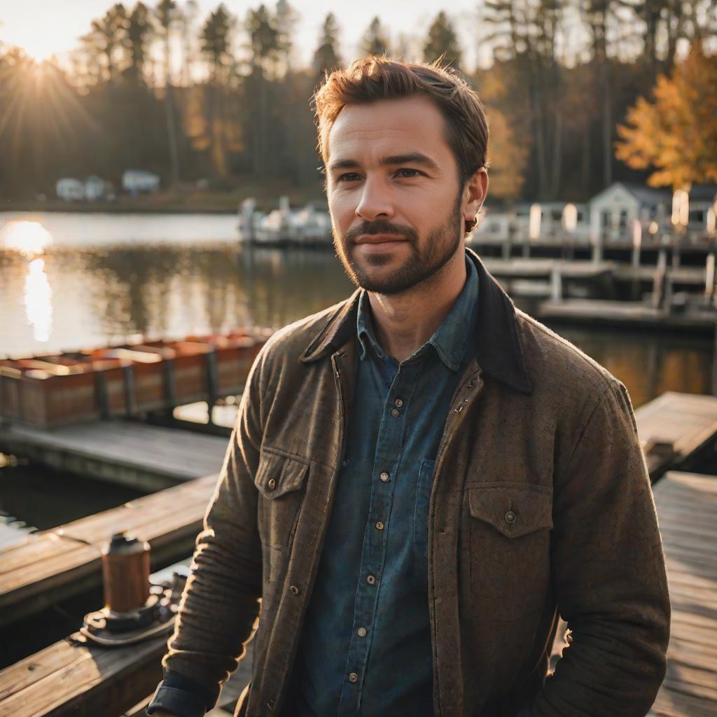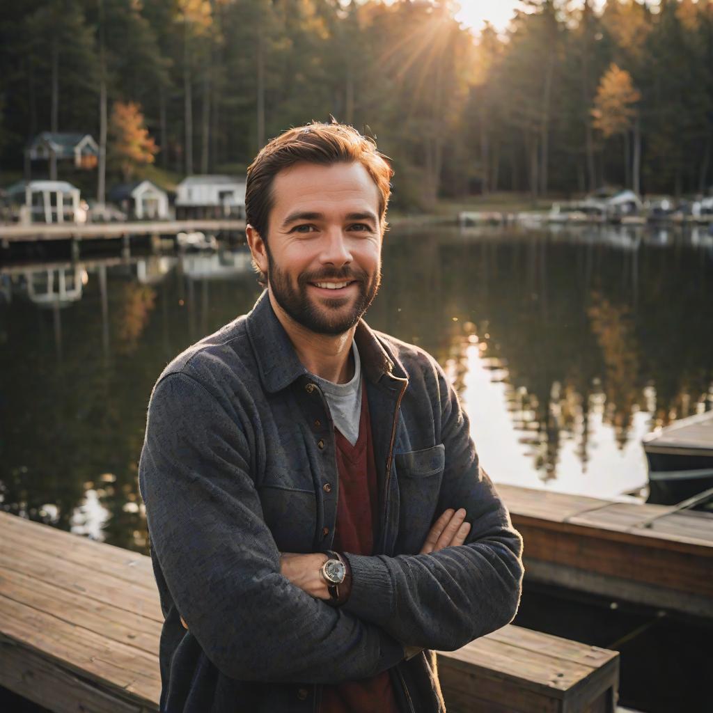 A candid lifestyle portrait of a man captured in a lakeside dock. The image features soft focus, warm tones, and natural lighting. Vibrant colors, subtle lens flare, and a dynamic depth create an airy atmosphere. The composition is casual and inviting, with lifestyle elements enhancing the sense of authenticity and warmth.