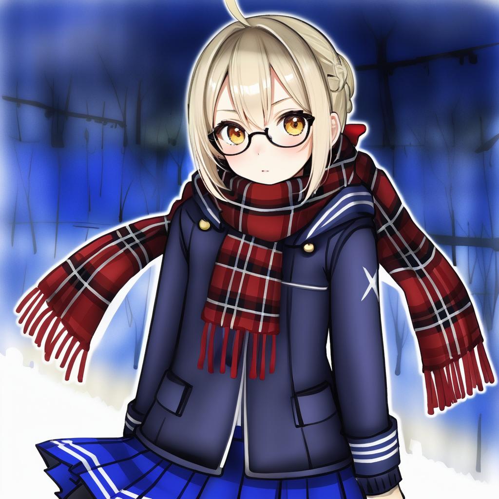 Mysterious heroine x alter (first ascension) (fate), fate (series), 1girl, yellow eyes, hair between eyes, glasses, black-framed eyewear, under-rim eyewear, blonde hair, short hair, ahoge, sidelocks, braid, french braid, serafuku, red scarf, plaid scarf, blue skirt, pleated skirt, black thighhighs, long sleeves, by artist nanashi (nlo), anime
