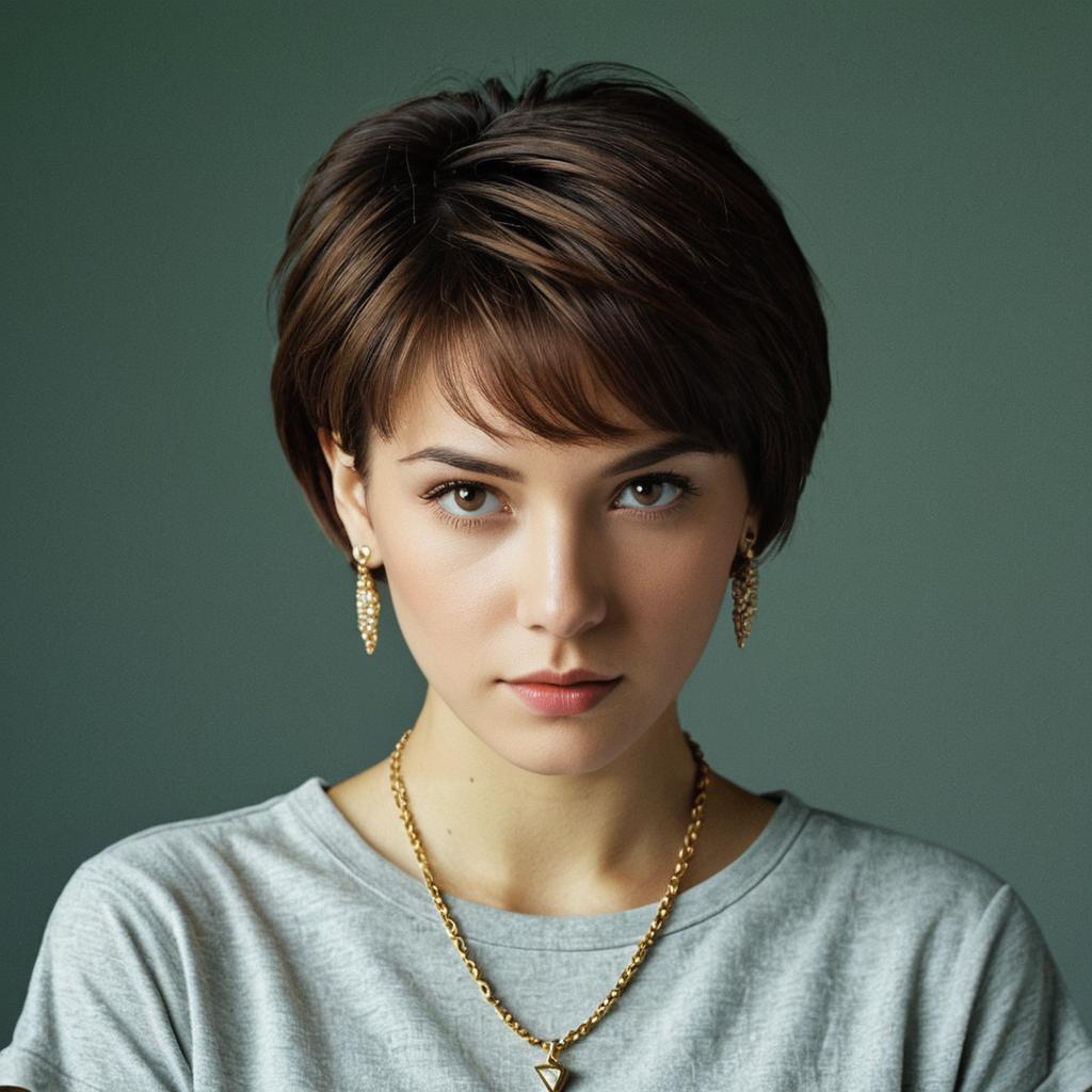 Full head hair wig woman,1girl, jewelry, solo, necklace, earrings, realistic, red hair, looking at viewer, upper body, tank top, short hair, lips, green eyes, brown hair