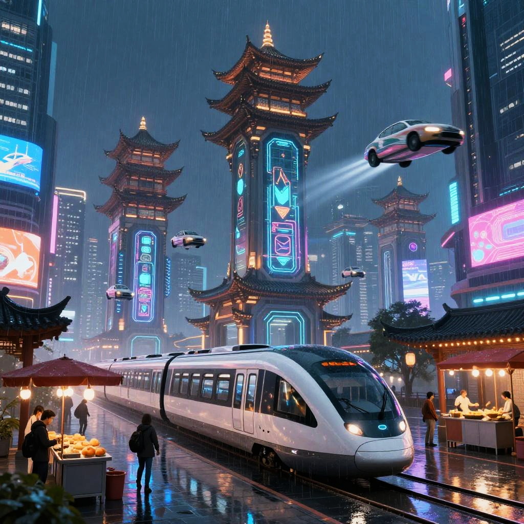 Asian futurism transportation hub with sleek maglev trains and flying cars zooming through a city filled with towering pagodas embedded with smart glass panels and AI-operated street vendors, set in a rainy night illuminated by pulsating neon and holographic advertisements
