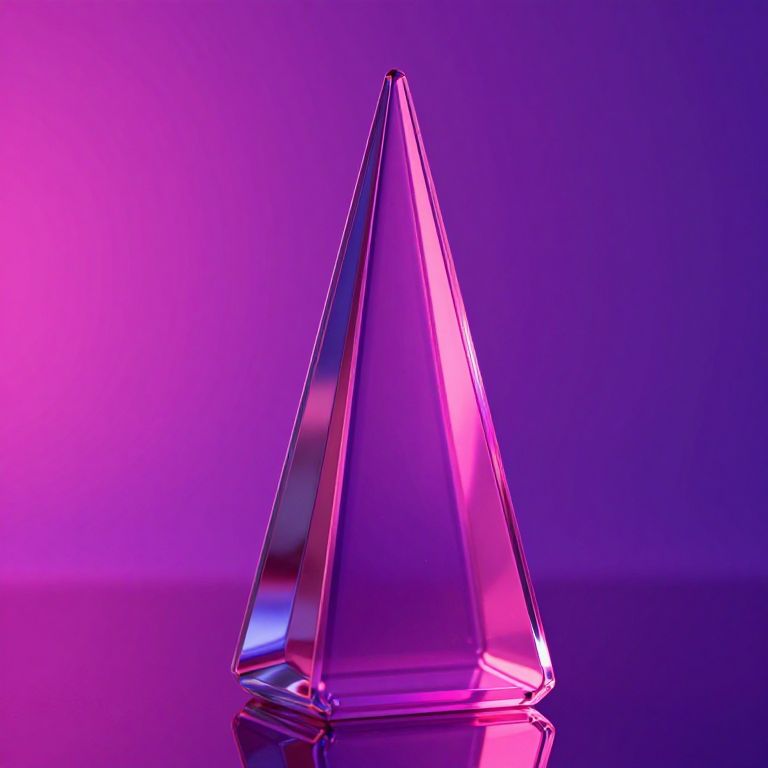 Triangle shaped bottle standing tall on a reflective surface, illuminated by neon pink and purple lights, futuristic style with sharp edges and glossy textures.