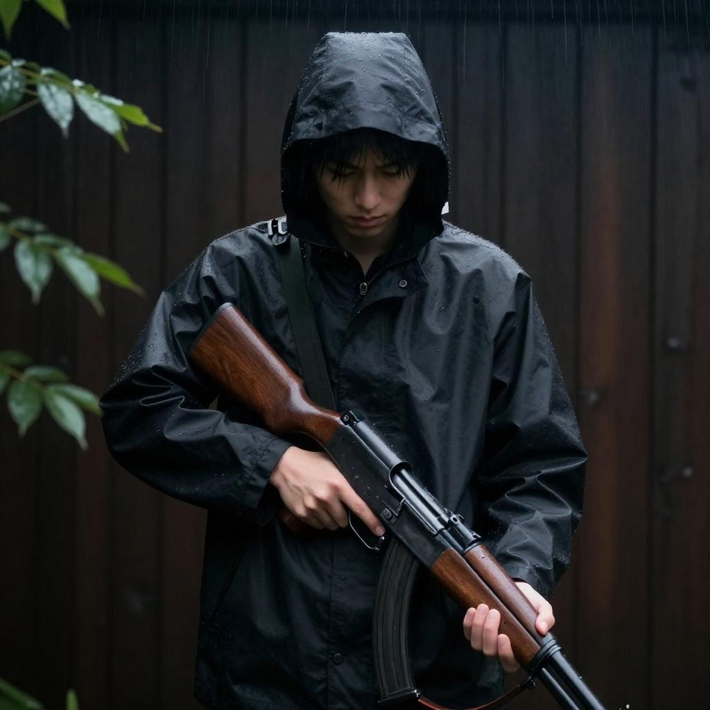 Photograph of a person in a black raincoat and hood, holding a rifle and aiming into the distance. Raindrops are visible, and green leaves are in the foreground. The background is a blurred, sunlit forest. The person's face is obscured by the hood.
