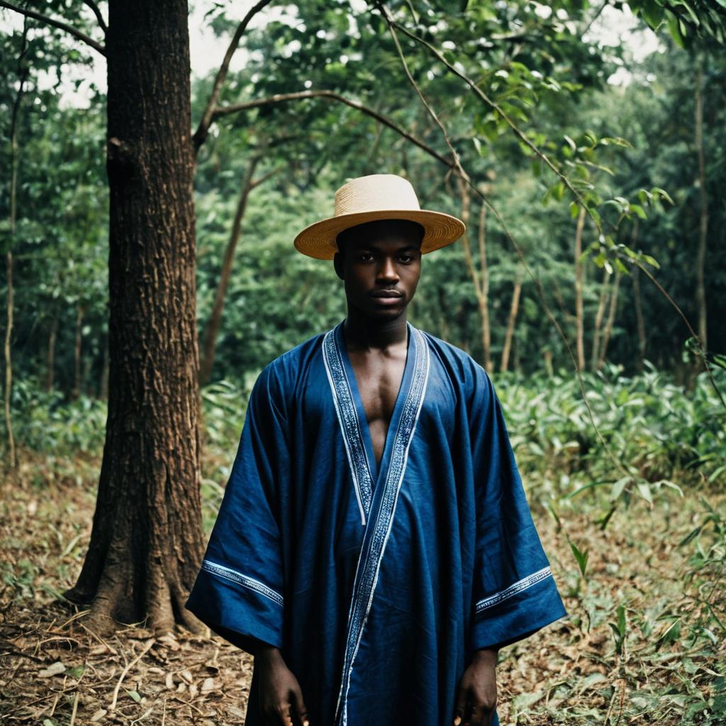 Portrait of a dark-skinned Nigerian man wearing a traditional blue robe and a beige wide-brimmed hat, standing outdoors in a lush forest setting. The man looks directly at the camera with a serious expression, surrounded by dense green foliage and trees.