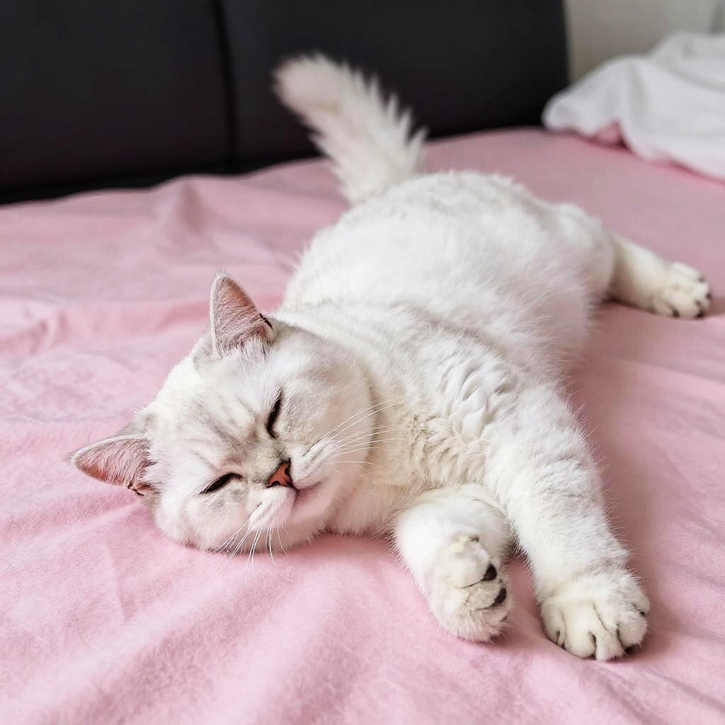 A photograph of a fluffy white cat with closed eyes, lying on its back on a crumpled, magenta-colored blanket. The cat's soft fur contrasts with the vibrant pink fabric, and its pink nose is visible. The background is slightly blurred, featuring cool blue tones. The cat looks relaxed and content, with its paws tucked under its body.