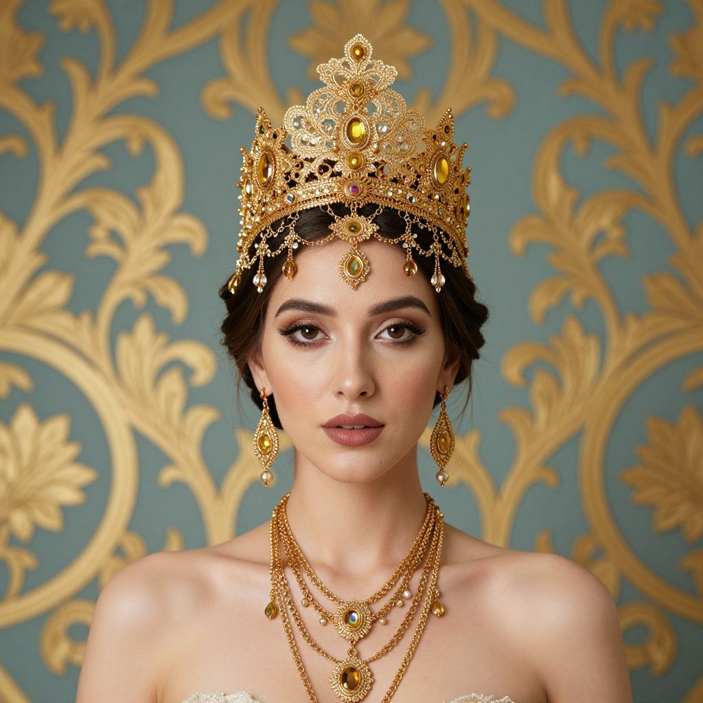 Photograph of a fair-skinned woman with dark brown hair styled in an updo, wearing an ornate, gold, jeweled crown adorned with intricate patterns and gemstones. She has large, dark brown eyes, well-defined eyebrows, and wears subtle makeup. She is also adorned with a gold necklace featuring multiple strands with green and gold pendants, and gold drop earrings. Her bare shoulders suggest she is topless. The background is a teal wall with an elegant, gold, damask pattern, adding a luxurious and regal atmosphere to the image. The woman's serene expression and the opulent accessories give her a royal, timeless appearance.
