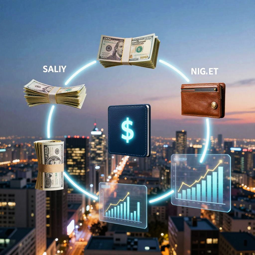 An artistic visualization of salary cycling through different forms – cash, digital wallet, and investment graphs, interconnected by glowing lines, set against a futuristic cityscape at dusk, featuring neon lights and transparent screens, emphasizing the flow of money in modern economy.