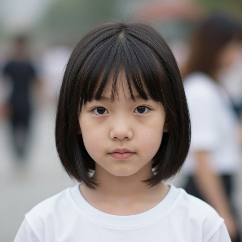 Photograph of a young Asian girl with straight black bob haircut, wearing a white shirt, standing in a blurred urban background.