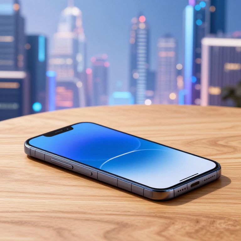 Photograph of a sleek, modern smartphone with a blue screen, lying on a wooden surface against a blurred cityscape background.