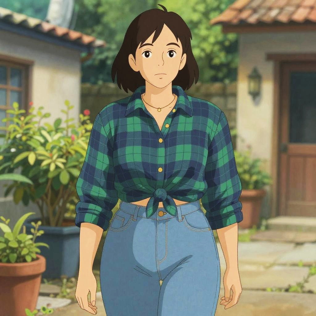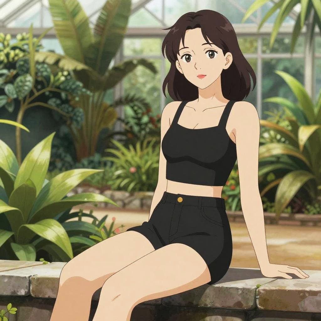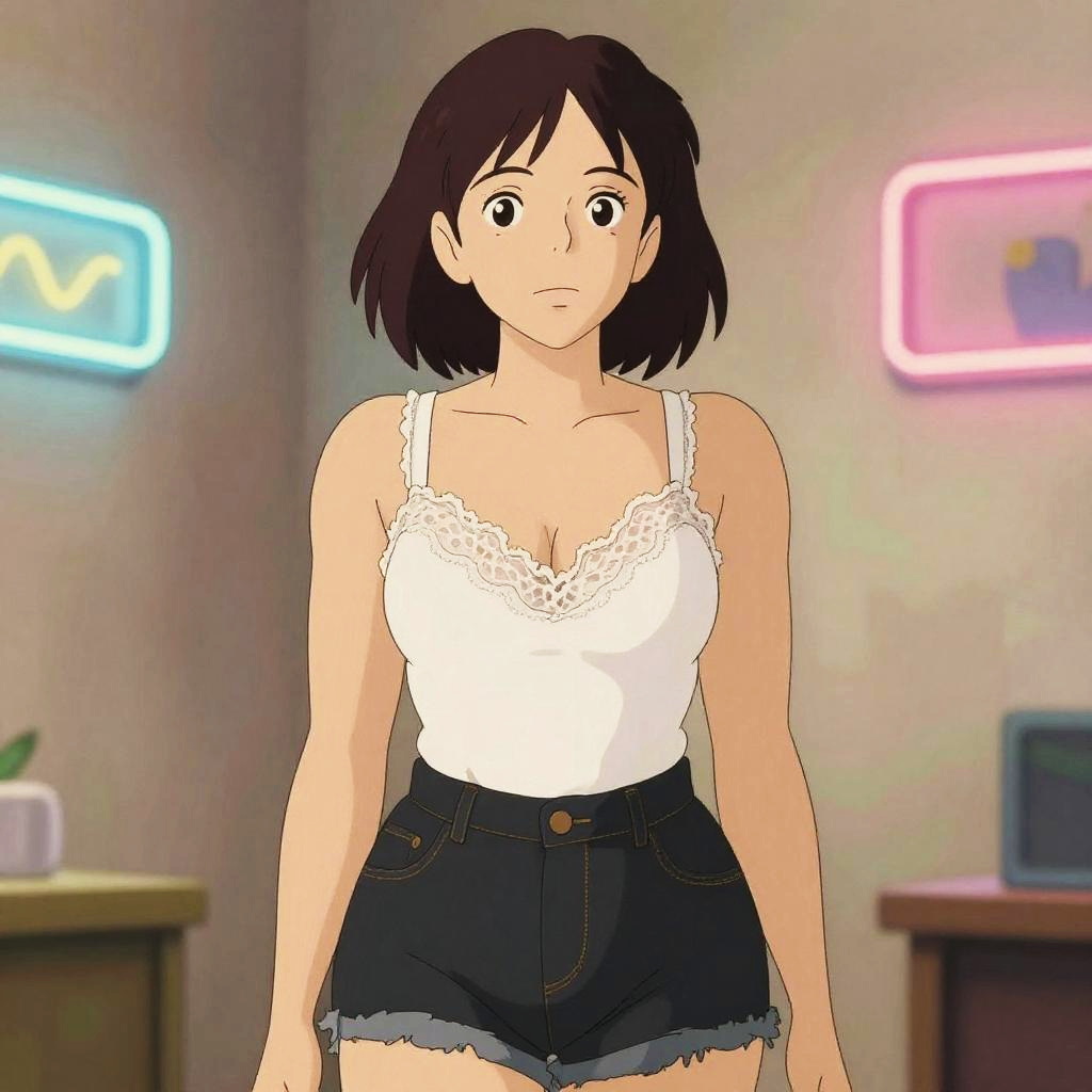 A busty woman in casual streetwear, wearing a heather gray tank top with a yellow graphic print and black fitted shorts, stands in a vibrant carnival street art setting. She has a delicate wrist accessory, subtle makeup, and straight long hair, all depicted in a Studio Ghibli visual style. Sexy. Pretty face and beutiful eyes