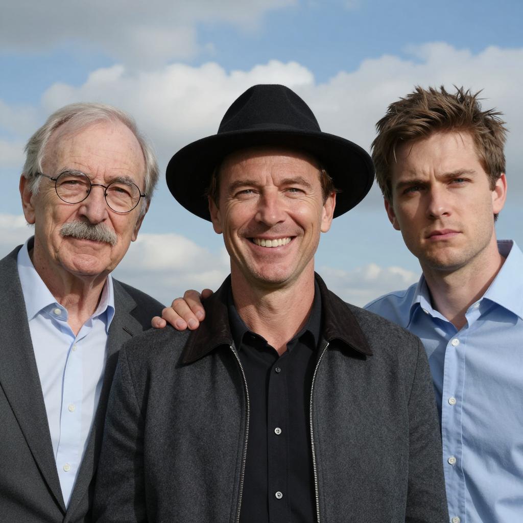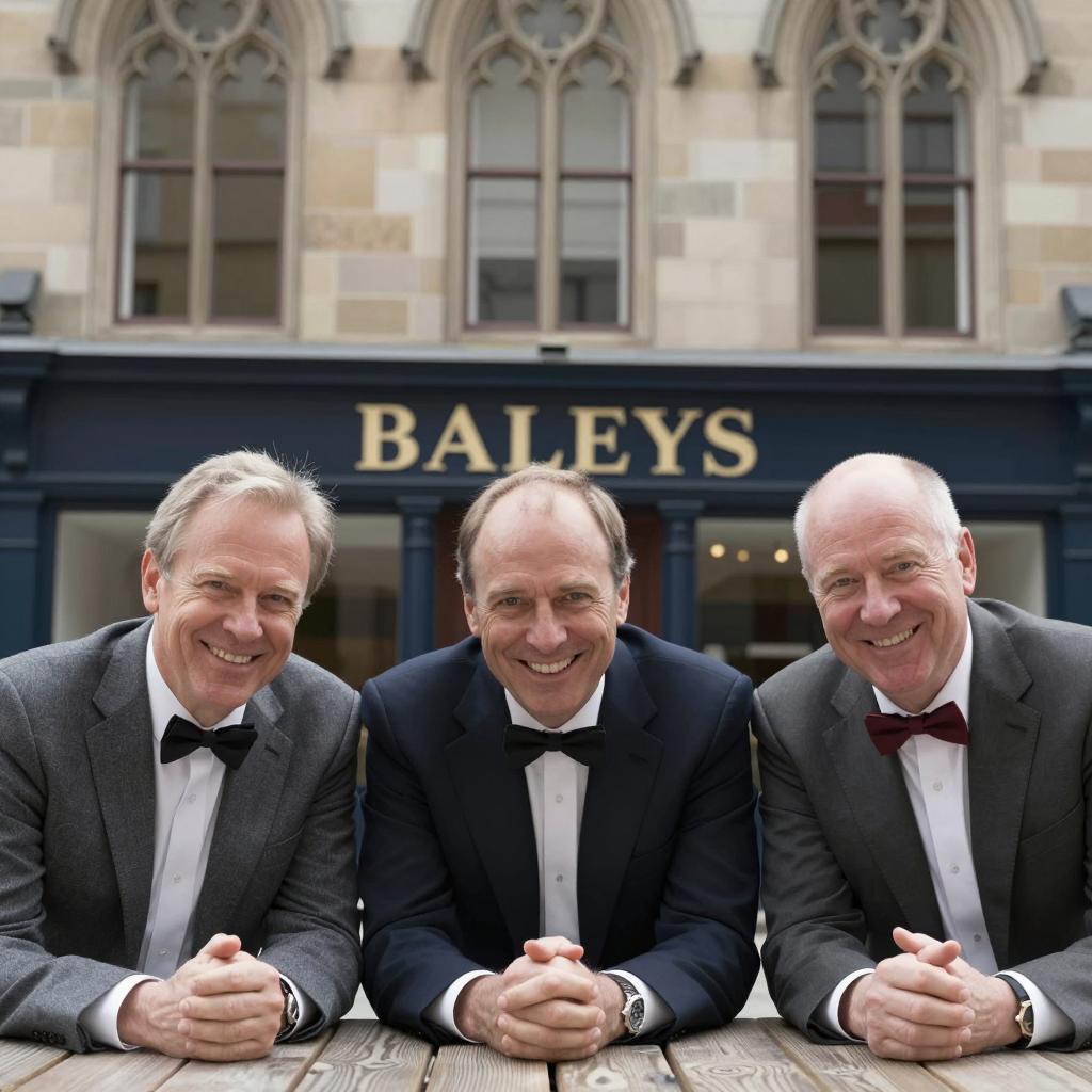 Three middle-aged men leaning forward on a table. Each wears a suit and bow tie. The background shows an old building with "Baleys" signage. Large, gothic-style "Impression" overlays the top. The men smile, with the central man's hair more receded. All three have light skin. The left man has short, light hair, the right man has a bald spot.