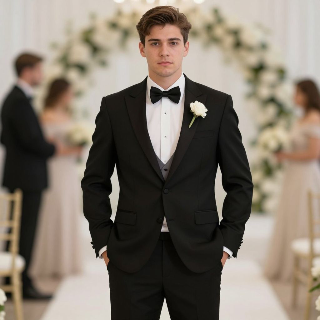 Groom costume reception, 1boy, male focus, solo, hands in pockets, bow, bowtie, jacket, shirt, white shirt, black bow, brown hair, formal, suit, pants, black bowtie, looking at viewer, vest, flower, blurry background, realistic, black pants, black jacket, tuxedo, blurry, closed mouth, collared shirt, long sleeves