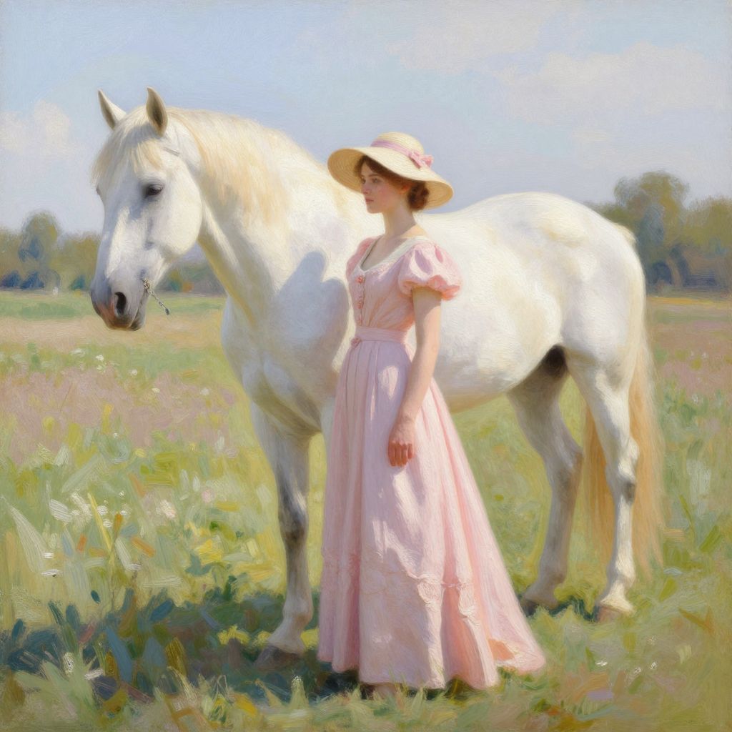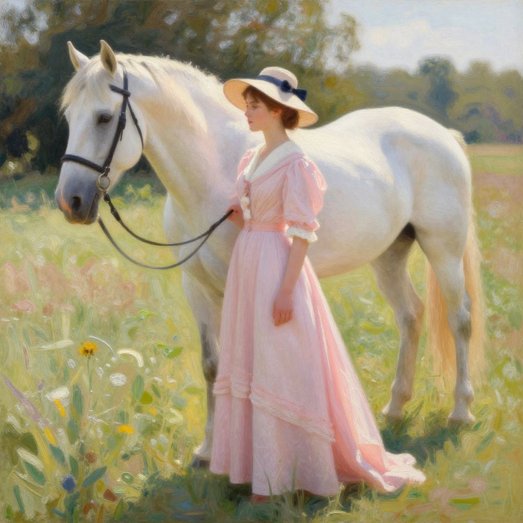 Digital painting of a young woman in a pink dress and wide-brimmed hat standing beside a white horse in a sunlit meadow.