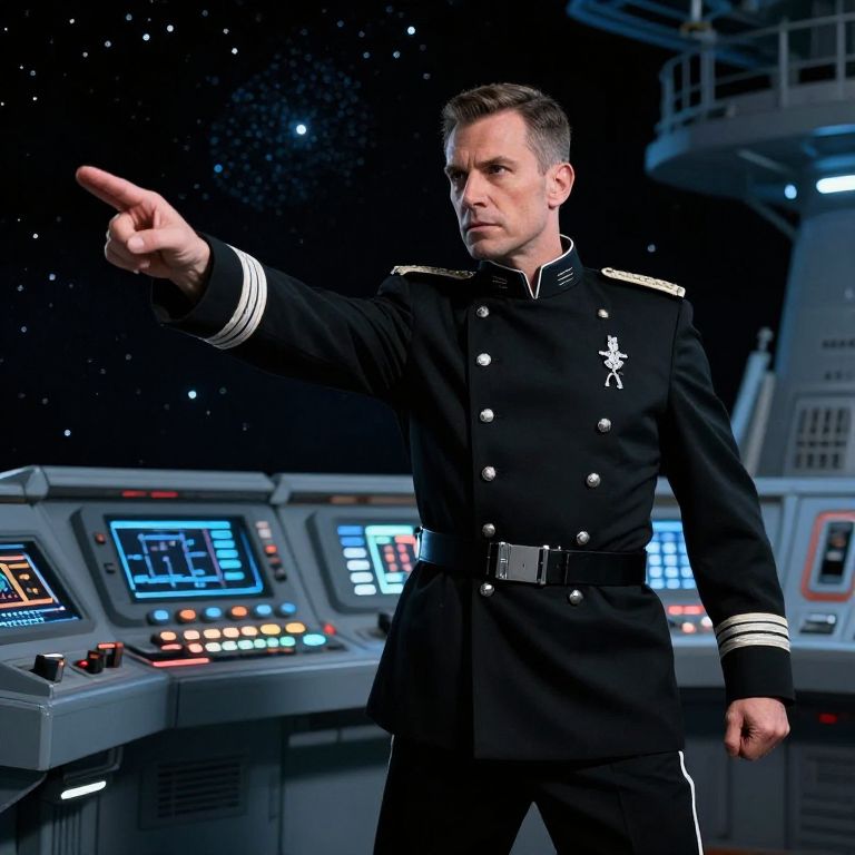 Imperial officer art, action scene depicting an imperial officer issuing orders atop a warship bridge, stern look, streamlined black uniform with ceremonial trim, advanced control panels illuminate the face, starry space backdrop, dynamic composition with attention to uniform detail and facial intensity