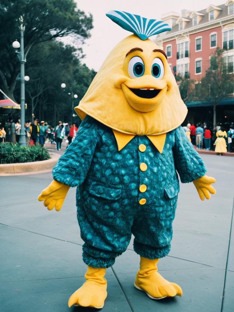 Man in Disney Flounder costume, cosplay editorial photography, realistic tones