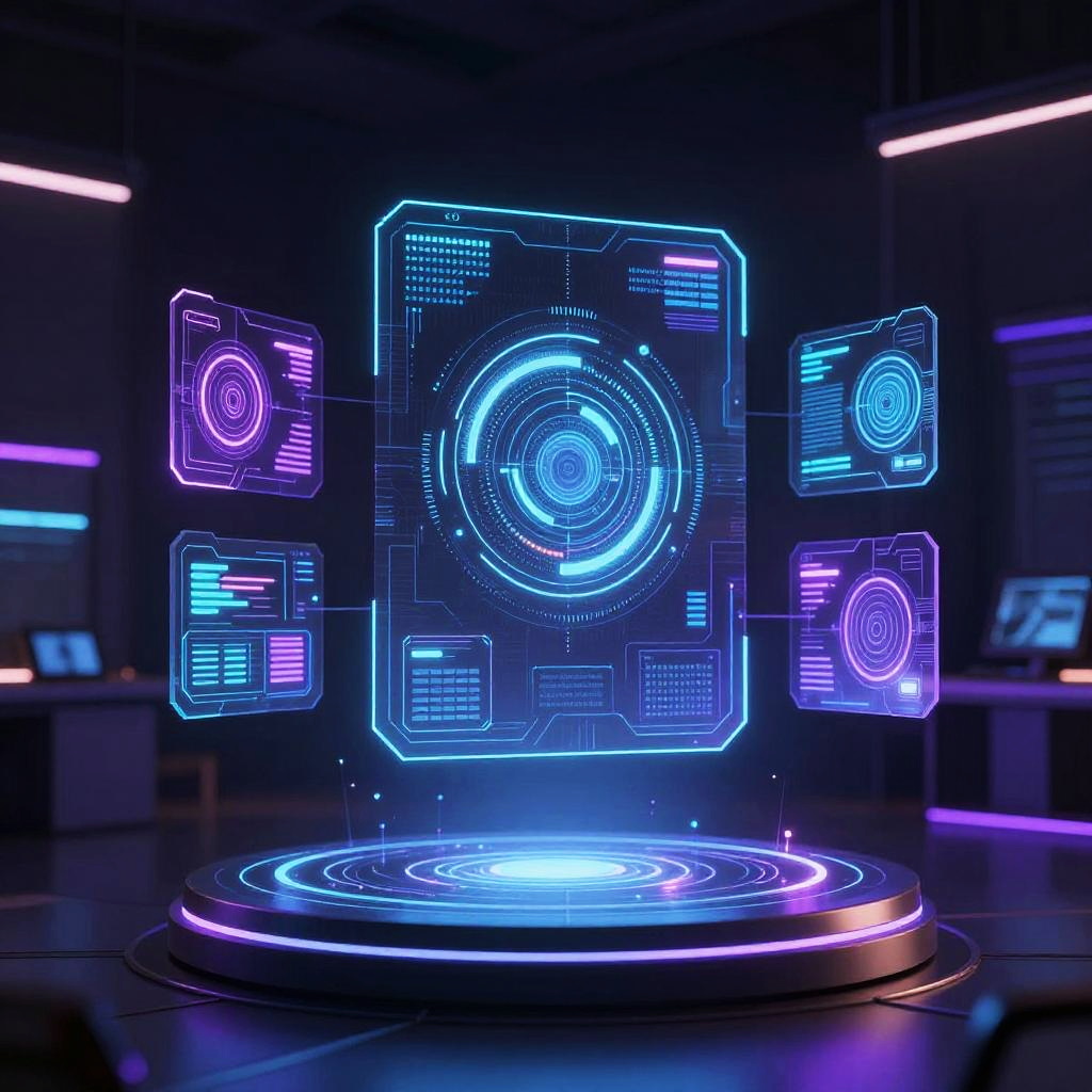 Neon-lit futuristic holographic interface with blue and purple circular and square digital displays floating above a glowing circular base. High-tech, sci-fi ambiance