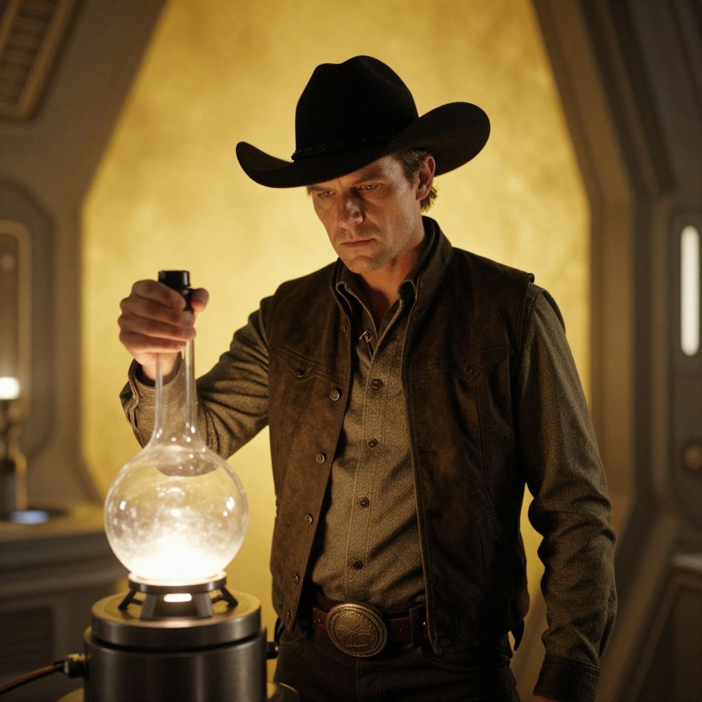Photograph of a serious, white male cowboy in a black hat, holding a glowing glass lantern in an ornate, yellow-lit room.