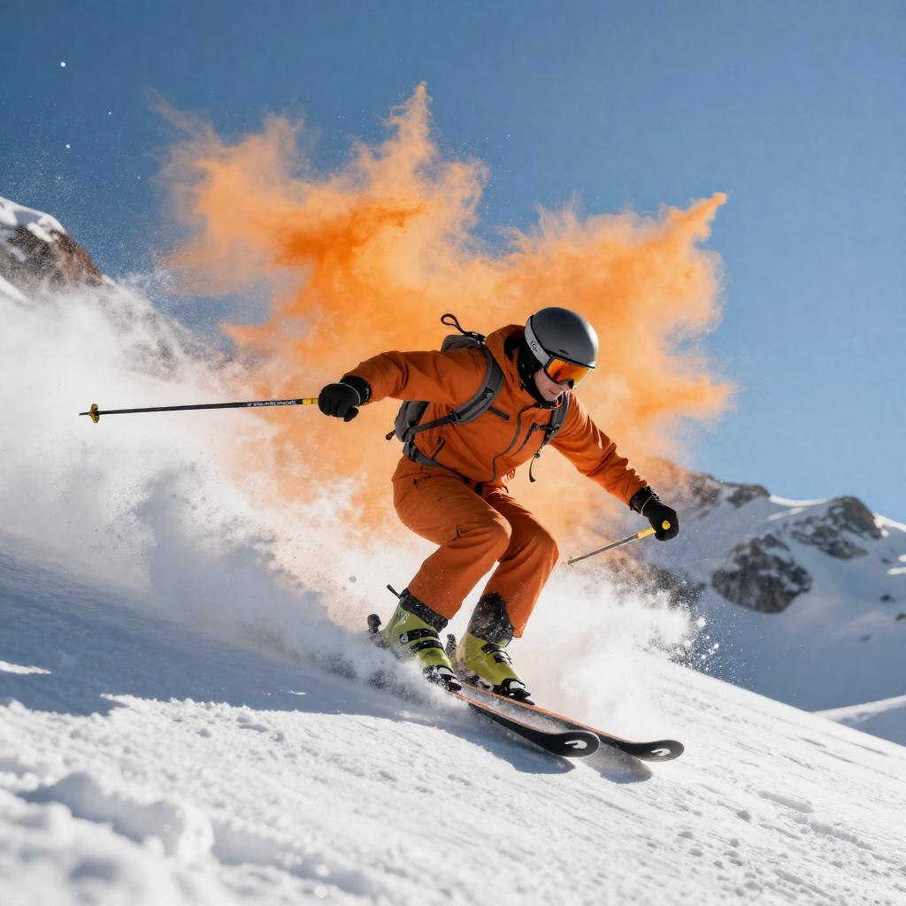 Skier mid-jump, arms outstretched, ski poles in hands, surrounded by intense orange explosion, snow-covered mountain slope in background, clear blue sky above. Skier's face not visible. Snow flying in all directions. Bright, dramatic lighting.