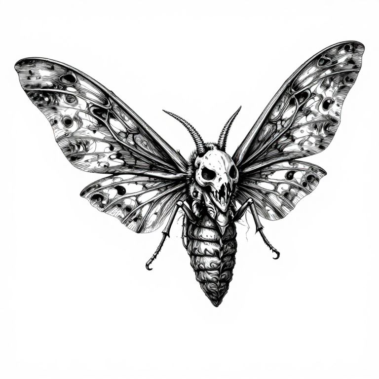 The image presents a highly detailed, anatomical illustration of a hideous vampire moth, reminiscent of the style of artists Bernie Wrightson and John Romita. The artwork is rendered in a black and white line drawing, emphasizing intricate textures and anatomical details. The moth's body is a complex amalgamation of organic and insect-like features, with a prominent skull-like head adorned with sharp horns and a pair of large, bat-like wings. The wings are detailed with intricate patterns and textures, suggesting a delicate yet menacing structure. The overall composition is dynamic, with the moth's body and wings creating a sense of movement and depth. The interplay of light and shadow enhances the three-dimensional effect, making the illustration appear almost lifelike. The image is a striking representation of a fantastical creature, blending elements of nature and fantasy in a visually captivating manner.
