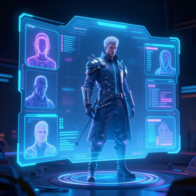 Character role generator concept, futuristic digital interface glowing with holographic screens displaying various character archetypes, sleek cyberpunk style, neon blues and purples, intricate UI elements, ambient sci-fi atmosphere