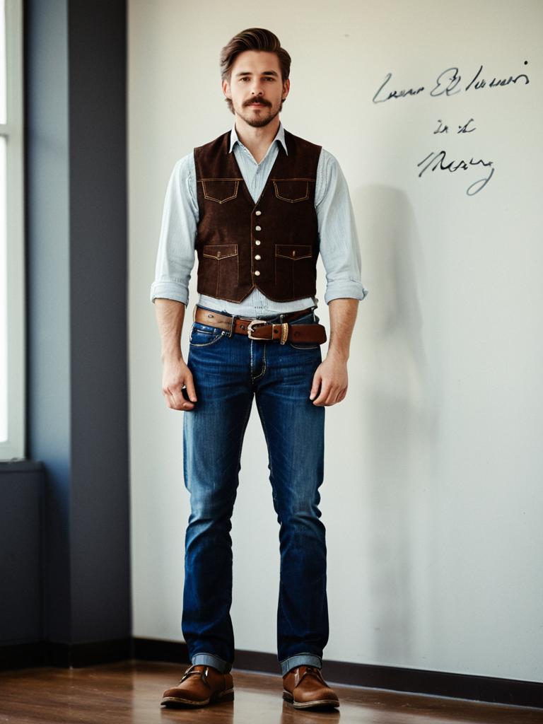 Full body portrait of a young man with brown hair and mustache standing indoors against a white wall with a signature. He is wearing a brown buttoned vest over a light blue shirt with rolled sleeves, dark blue jeans with a brown leather belt, and brown leather shoes. The background is simple and slightly blurred, emphasizing the subject.