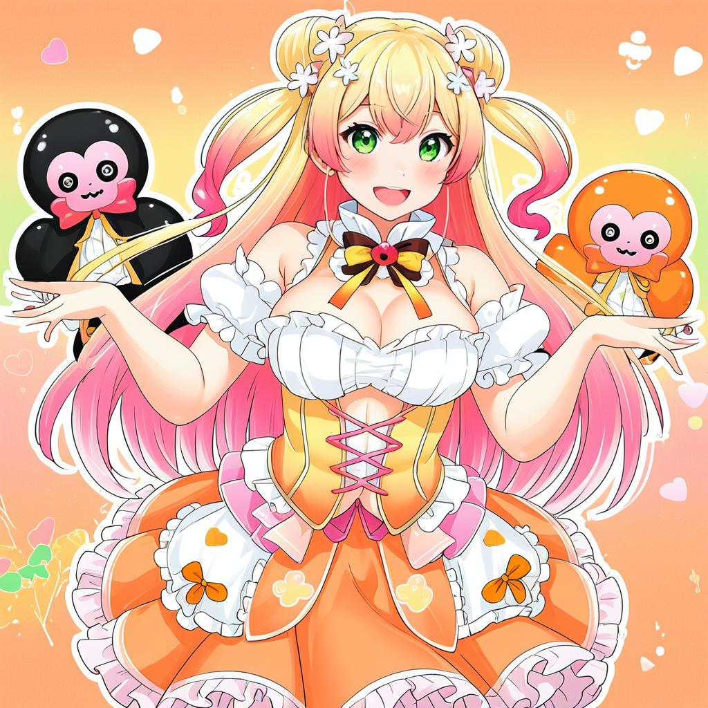 Momosuzu nene (1st costume), hololive, 1girl, fang, green eyes, hair between eyes, blonde hair, long hair, gradient hair, pink hair, two side up, double bun, hair flower, large breasts, medium breasts, cleavage, cleavage cutout, cutout above navel, frilled shirt, orange shirt, orange skirt, frilled skirt, sleeveless shirt, multicolored bow, brown bowtie, orange bowtie, yellow bowtie, multicolored bowtie, bare shoulders, virtual youtuber, virtual youtuber, underbust, corset, by artist senri gan, anime