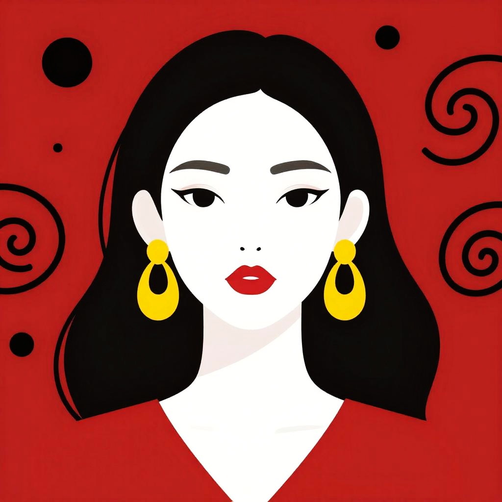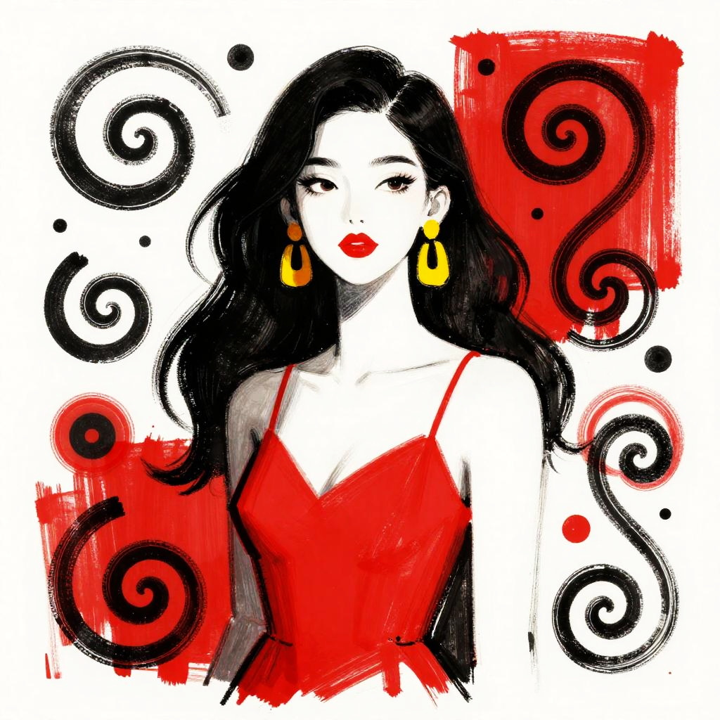 This is a digital drawing in a bold, abstract style. The central figure is a woman with fair skin, black hair, and red lips, wearing a red dress and large yellow earrings. Black and red swirls and patterns surround her on a red and white background, giving the image a vibrant, modern feel. The overall style is reminiscent of modern, expressive portraits.