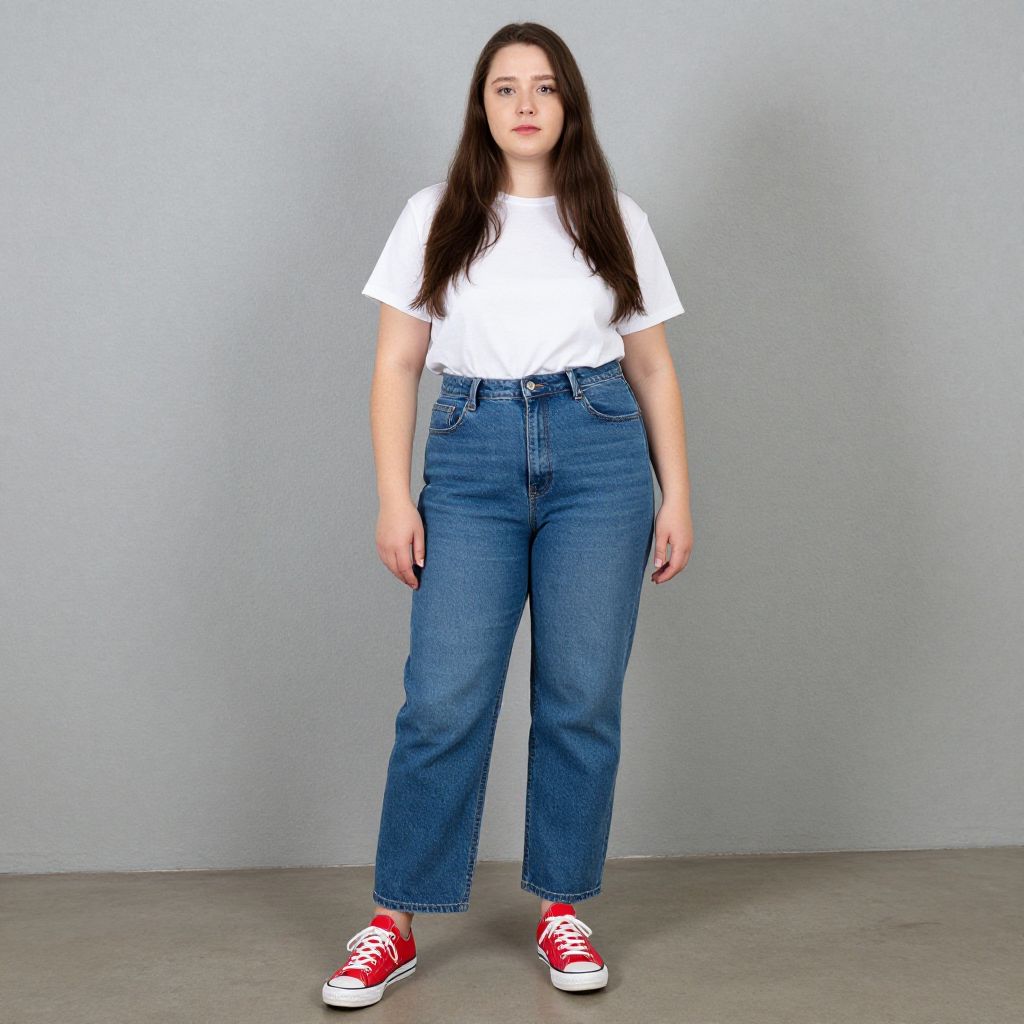 Casual outfit chubby woman, 1girl, solo, denim, pants, red footwear, jeans, long hair, shoes, shirt, full body, brown hair, realistic, looking at viewer, standing, sneakers, white shirt, blue pants