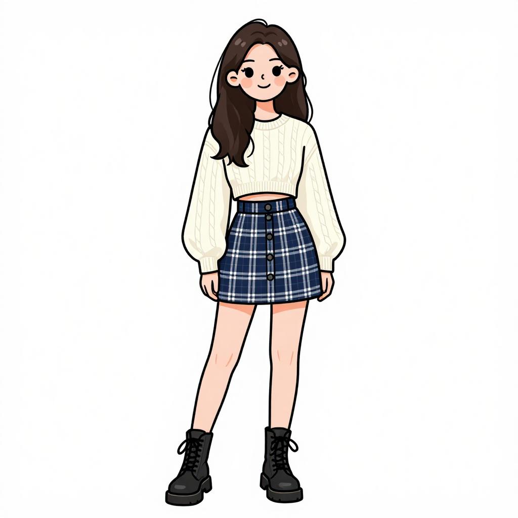 Woman with pretty face and pretty hair. smiling Person, casual streetwear, cream high-waisted wide-leg jeans with contrast stitching, five-pocket design, belt loops, black chunky platform boots, light blue ribbed sweater with a crew neck and long sleeves, solid color, standing pose, plain white studio background --sref 1467