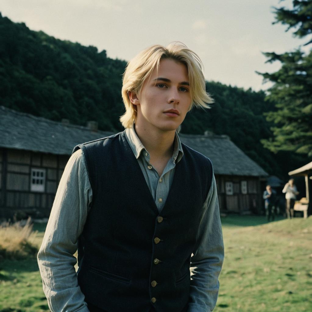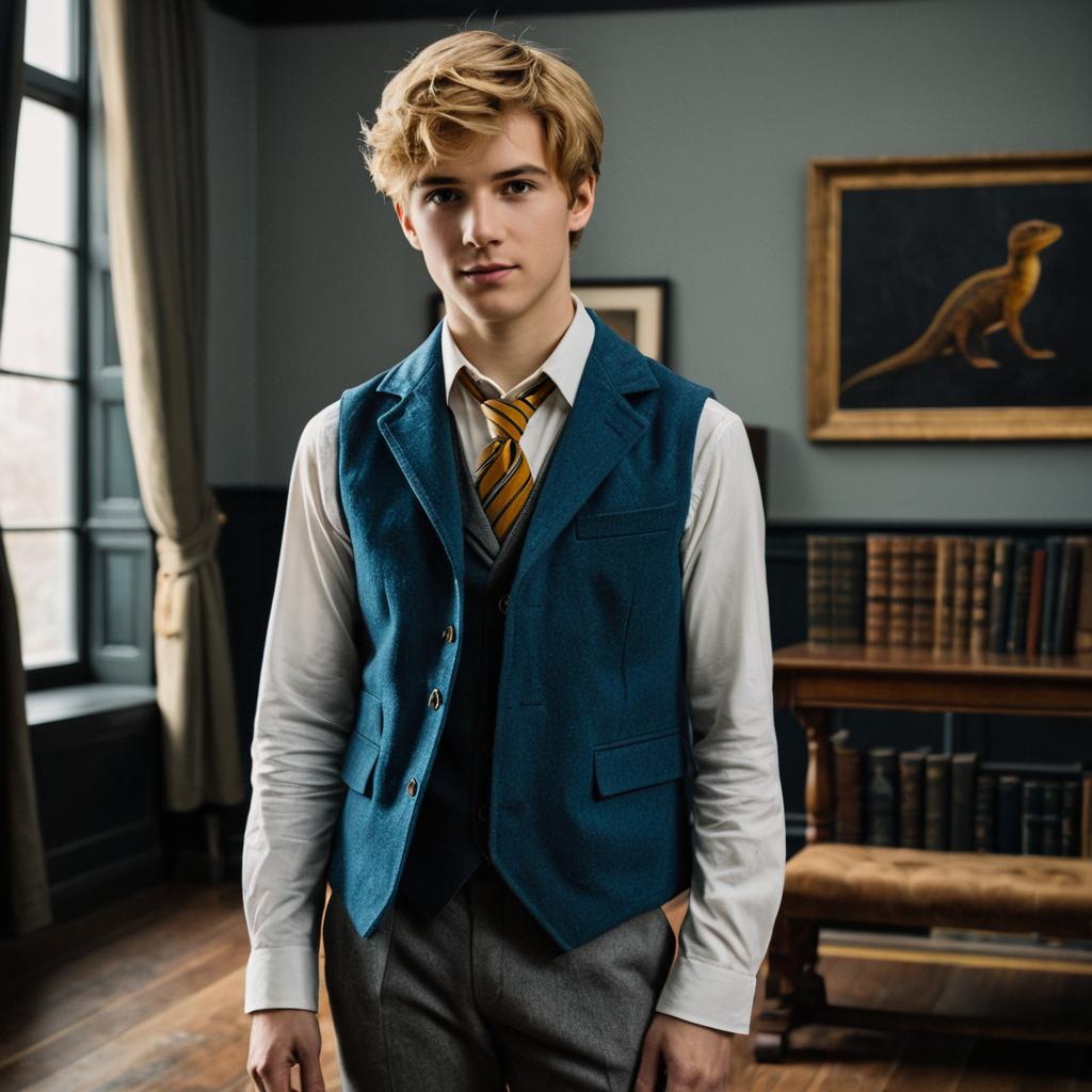 Portrait of a young Caucasian male with blonde hair wearing a vintage-style blue vest over a white collared shirt and a striped yellow and brown tie. He is standing indoors in a room with classic decor, including a wooden floor, bookshelves with old books, and framed artwork on the walls.